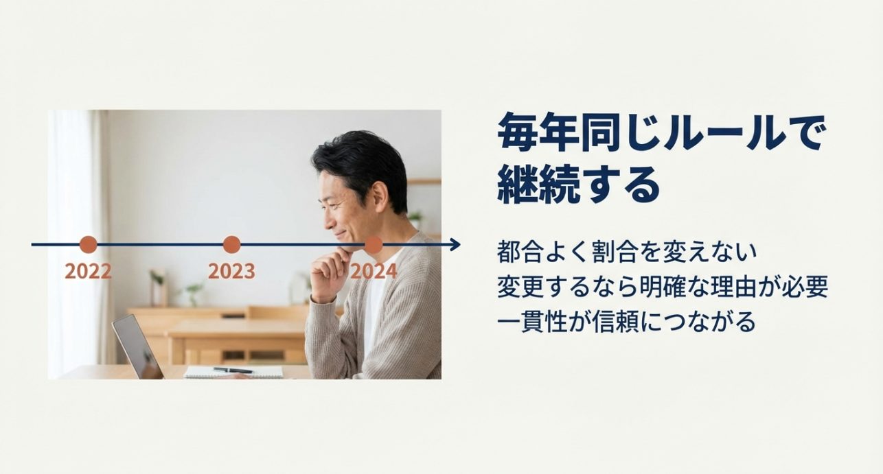 どちらでもOKですが、毎年同じルールで運用するのが大事です。 年によってコロコロ変えると「都合のいい調整」に見えやすいです。