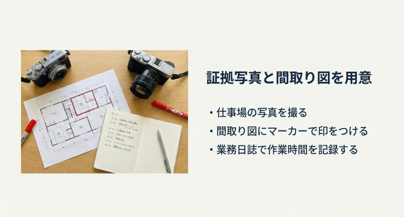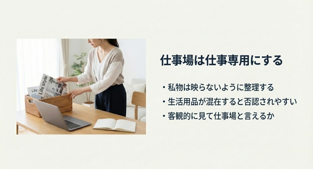 写真は「年に1回」でもいいので、決算期あたりに撮っておくと後で困りません。 ポイントは、仕事スペースが仕事っぽく見えること。 机の上にPC、モニター、仕事用書類、在庫、専門機材などがあると説得力が出ます。 逆に、寝具や衣類が写ると「生活じゃん」になりやすいので、撮影前に片付けるのも大事です。