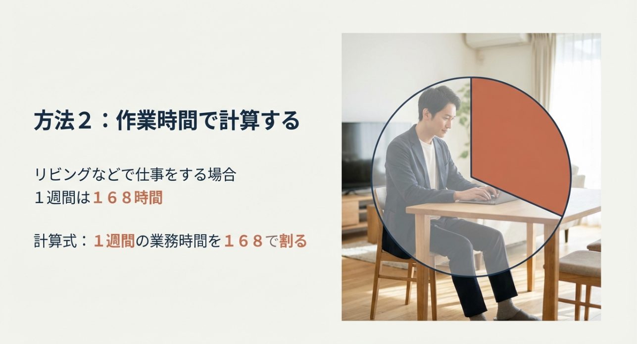 時間基準は、ワンルームやリビング兼用みたいに「面積で切れない」人の現実解です。 ざっくり言うと、1週間168時間のうち、何時間を仕事に使っているかで割合を作ります。 ここ、気になりますよね。 だって「時間って証明できるの?」って話になるからです。 結論としては、完璧な証明じゃなくていいので、合理的に説明できる記録を作るのがポイントです。