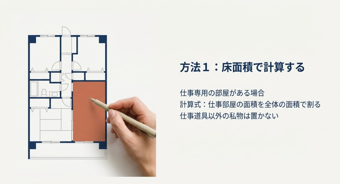 面積基準は、税務署への説明が一番しやすい王道です。 自宅全体の床面積に対して、事業専用として使っているスペースの割合を出します。 ここで大事なのは、「あなたの感覚」じゃなくて「誰が見てもそう言える材料」を揃えること。 面積基準は、その材料を作りやすいのが強みです。