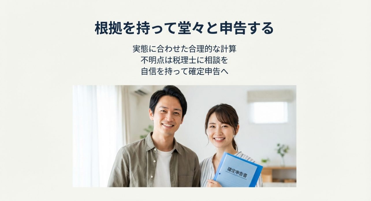 ここも断定は避けて、最終判断は税務署・税理士など専門家に相談してください。 特に水道・ガスは無理に攻めると否認リスクが上がりやすいので慎重にいきましょう。