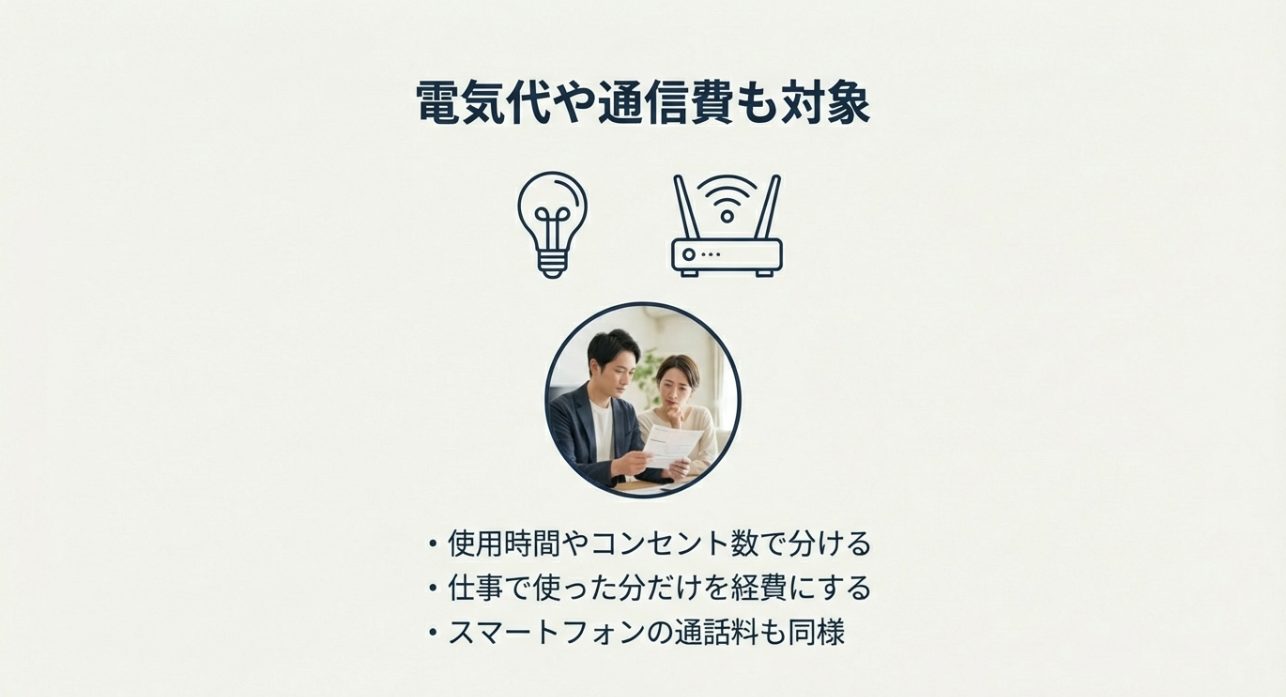 家賃の次に悩むのが、電気代・水道光熱費・通信費です。 ここは「面積」よりも使用実態が重視されやすいです。 つまり、部屋の広さより「どれくらい仕事で使ってるか」が見られます。 だからこそ、雑に割合を決めると弱いし、逆に実態に沿って組み立てれば説明が通りやすい分野でもあります。