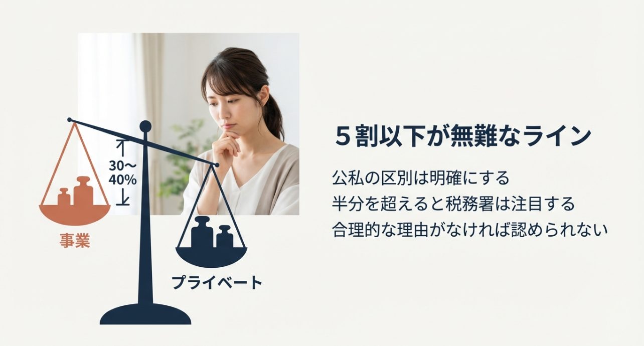 目安感としては、在宅中心でも20〜30%あたりは説明しやすいケースが多いです。 理由はシンプルで、生活との混在がある前提でも「時間基準でこれくらいなら自然だよね」と言いやすいからです。 逆に40%を超えると、生活実態との整合性を突っ込まれやすいので、写真・配置・専用機材などで「仕事に寄っている」根拠を厚くします。
