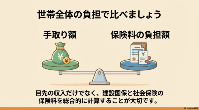 また、建設国保は定額に近い保険料体系の組合が多い一方、市町村国保は所得連動が中心です。 世帯所得が高いなら建設国保のほうが有利なこともありますし、所得が低いなら市町村国保の軽減が効く場合もあります。 どちらが得かは世帯全体で比較する視点が必要です。 扶養を外れることだけに意識が向くと、保険料の全体最適を見失いやすいです。