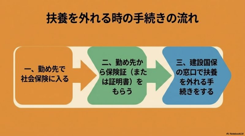 まずは、建設国保で「いつ扶養を外れるのか」を整理します。 ここを先に押さえておくと、収入調整を考える場面でも、外れた後の手続きを考える場面でも判断がブレにくくなります。