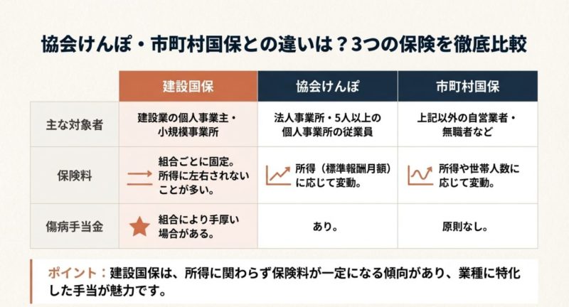 建設国保加入条件を検討するときに、どうしても避けて通れないのが「他の保険との比較」です。 特に、一人親方や小規模事業者の場合は、市町村国保(いわゆる普通の国民健康保険)とどちらがトータルで有利なのか、すごく気になるところだと思います。