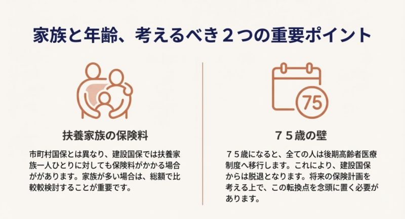 建設国保加入条件の中でも、意外と見落とされがちなのが「家族加入」と「年齢制限」の話です。 実務上は、世帯としてどう入るかで保険料も変わってきますし、将来の後期高齢者医療制度との切り替えも関係してきます。