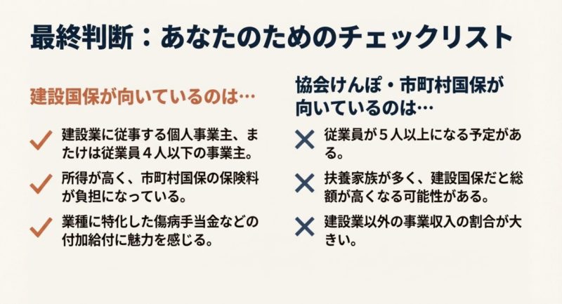 最後に、建設国保加入条件を踏まえて「結局どうやって選ぶか?」という実務的なまとめをしておきます。 ここまで見てきたように、建設国保か市町村国保か、あるいは協会けんぽか、正解は人によってバラバラです。