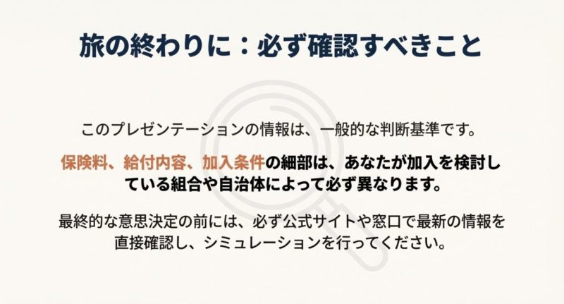 - 実際の金額や細かな条件は、加入を検討している建設国保組合や市区町村、協会けんぽなどの公式資料で必ず確認してほしいこと