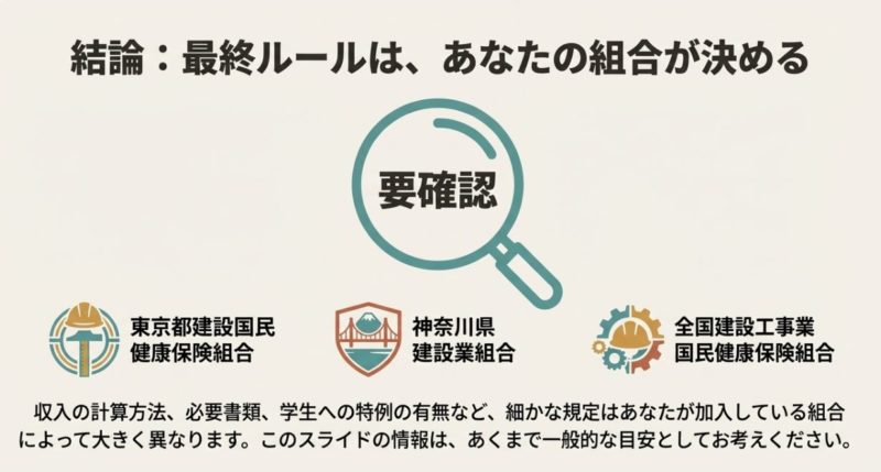 - 学生150万円特例など、組合差があるので所属組合の規約確認が必須