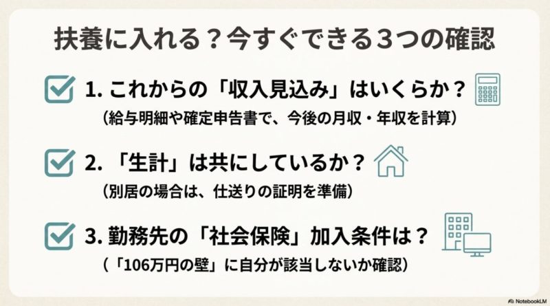 最後に、建設国保の扶養条件を“実務の目線”でまとめます。 ここまで読んだあなたは、もう「130万円だけ見ればいい」みたいな単純な話じゃないって分かったと思います。 だからこそ、最後は行動に落としましょう。