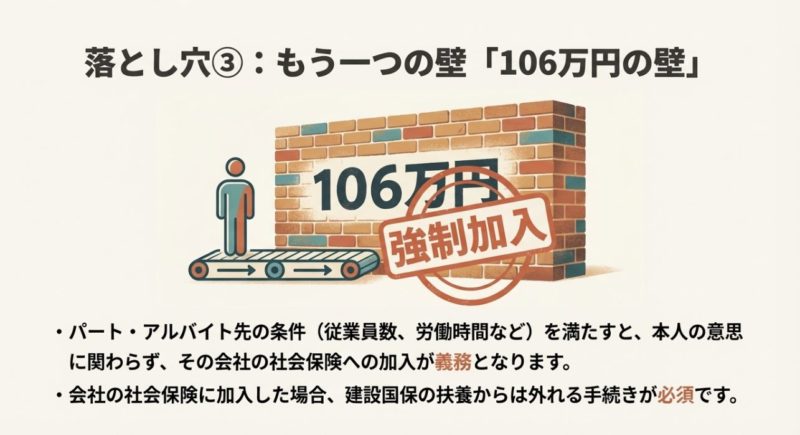 次に大事なのが106万円の壁です。 これは「扶養から外れる・外れない」というより、勤務先の条件を満たすと本人が社会保険(健康保険・厚生年金)に加入しないといけないという話です。 つまり、建設国保の扶養条件を満たしていても、勤務先の要件で“自動的にルートが変わる”ことがあるんですよね。