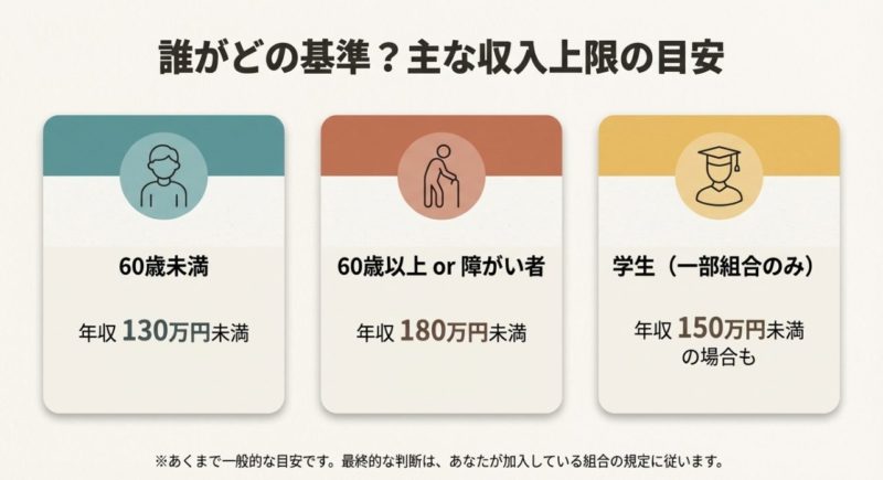 また、60歳以上や一定の障害要件に当てはまる場合は、180万円未満の基準に緩和されることがあります。 とはいえ、これも「年齢だけで自動的に通る」じゃなくて、収入の内訳を確認されることがあるので、親の扶養や高齢配偶者の場合は要注意です。