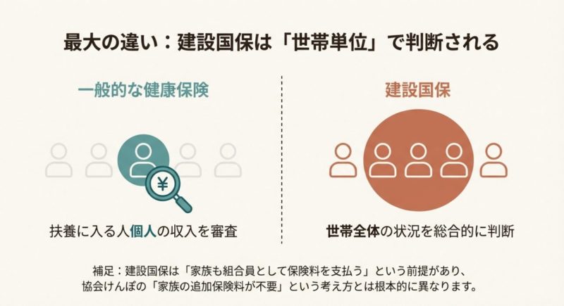 ここがポイントで、建設国保は「家族も入れる」けど「誰でも入れる」わけじゃないんですよ。 つまり、家族として入れるための条件(収入、同居別居、生計維持など)を満たしているかを見られます。 税金の扶養(103万円とか)だけ見て「大丈夫でしょ」と決め打ちすると、建設国保ではズレることがある。ここがいちばんの落とし穴です。