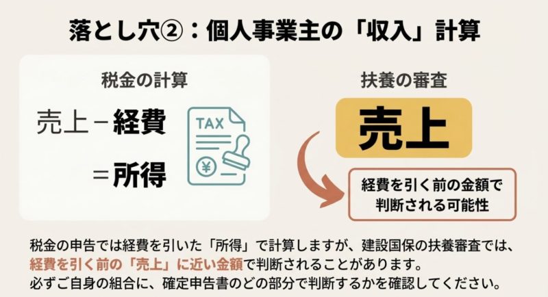 そしてもう一つ、もっと破壊力があるのが自営業(フリーランス)の収入判定です。 税金だと「売上−経費−青色申告控除=所得」で見ますよね。 でも建設国保の扶養条件では、青色申告控除を差し引けない、経費も“直接経費だけ”みたいに厳しめに見られることがあります。