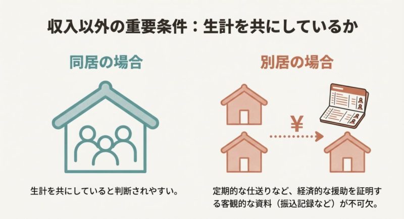 同居の場合は、生活が同じ財布で回っていると判断しやすいので、「生計維持」の説明が通りやすい傾向があります。 ただし油断は禁物で、同居でも収入バランスを見られることがあります。