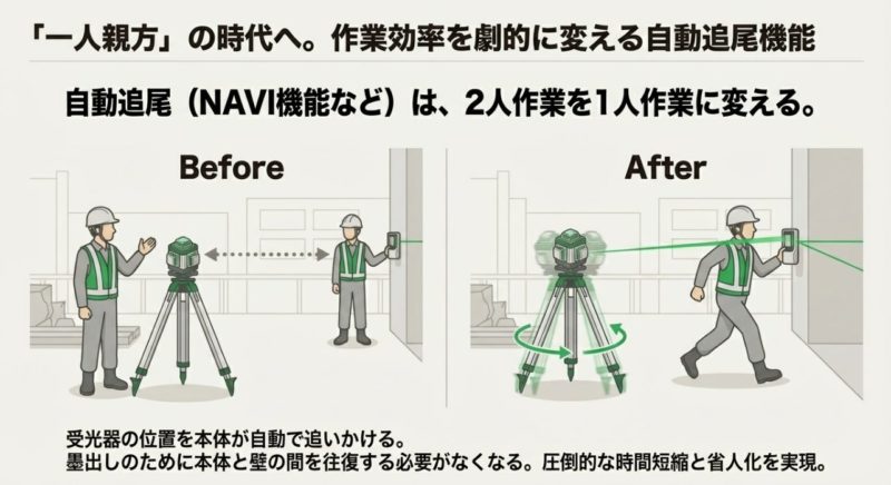 人手が薄い現場だと、ワンマン墨出しができるかは切実です。 受光器を持って動くだけで本体が追尾してくれるNAVI系や、オートベースの仕組みがあると、往復が減ってテンポが変わります。 これ、慣れると「もう戻れない」ってなる人が多いです。