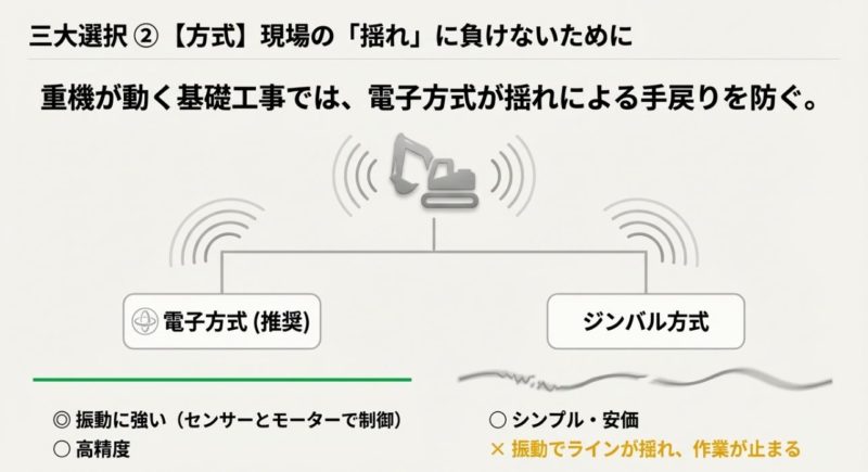 基礎工事で本当に差が出るのが、電子整準かジンバル式かです。 ジンバル式は構造がシンプルで扱いやすい反面、重機の振動や風でラインが揺れて「決めたい瞬間に決まらない」ことが起きやすいです。 これ、地味にストレスですよね。