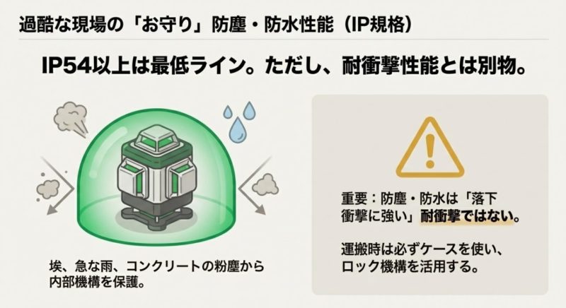 IP等級が高くても「落下や衝撃に強い」とは別物です。 運搬時はロック機構やケース運用を徹底したほうが安全です。 安全に関わる最終判断は、取扱説明書と現場ルール、監理者の指示を優先してください。
