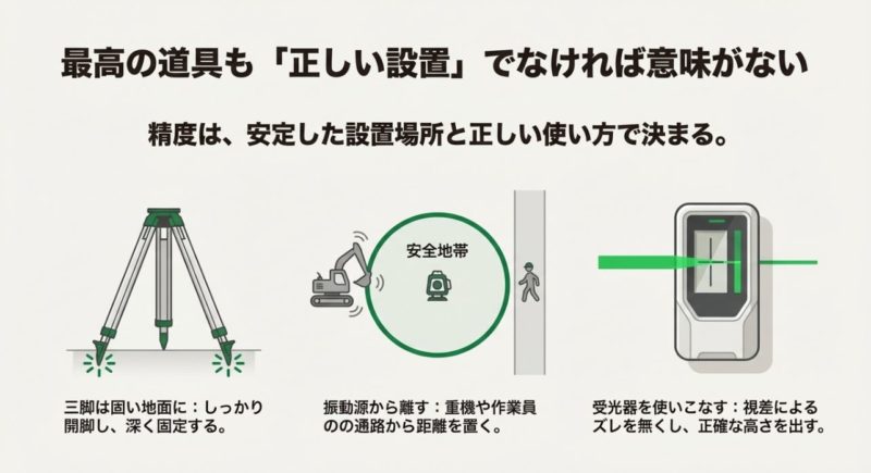 私のおすすめの考え方はシンプルで、「見え方」より「止まらない仕組み」を先に作ること。 受光器で中心を確実に取る、三脚を動かさない、電源を2系統で回す、要所は復測する。 これだけで、現場のストレスが結構減ります。