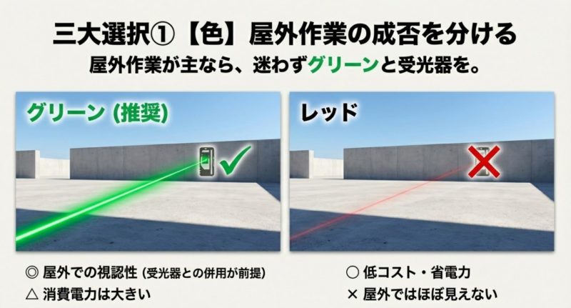 レーザーの色は、現場の体感に直結します。 赤色レーザーは省電力で価格も抑えやすい一方、屋外の視認性はかなり厳しいです。 基礎工事だと「結局受光器頼み」になりやすいので、迷うならグリーンレーザー寄りで考えるのがラクです。