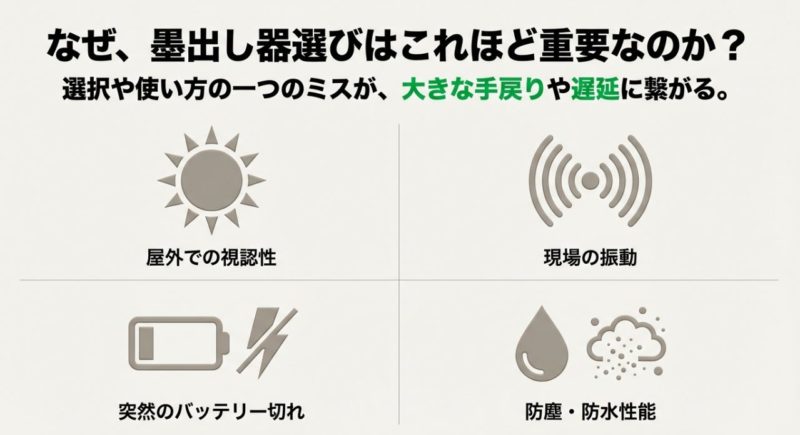 この記事では、私が現場目線で「基礎工事で失敗しにくいレーザー墨出し器の選び方」と「止まらない運用の組み方」を、できるだけ分かりやすくまとめます。 読む前より判断がラクになりますよ。