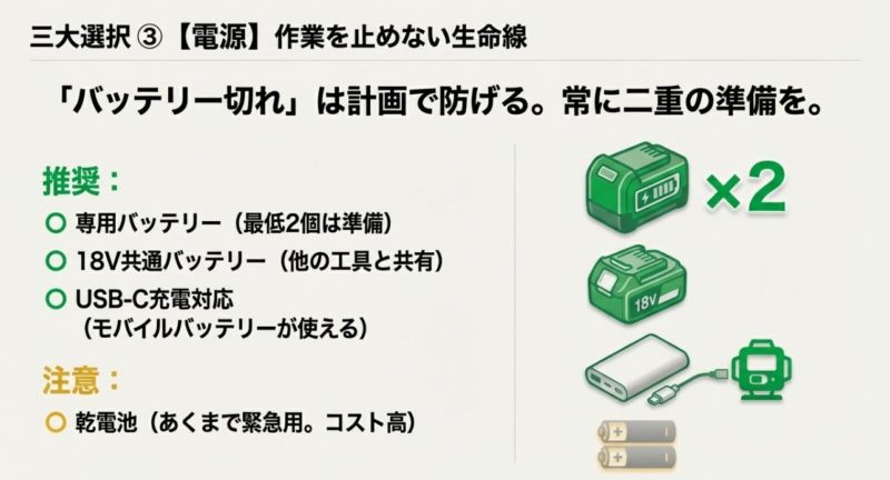 乾電池式は、入手性が最高です。 コンビニでも買えるので、突発対応に強い。 一方で、高輝度グリーンや多ラインだと消耗が早いことがあるので、ランニングコストが増えがちです。 専用バッテリーは長時間運用に強いけど、忘れたら終わり。共用バッテリーは運用がラクだけど、工具と取り合いになりやすい。 USB給電は延命に強いけど、ケーブルや端子の管理が必要。 結局、現場の流れに合わせて選ぶのが正解です。