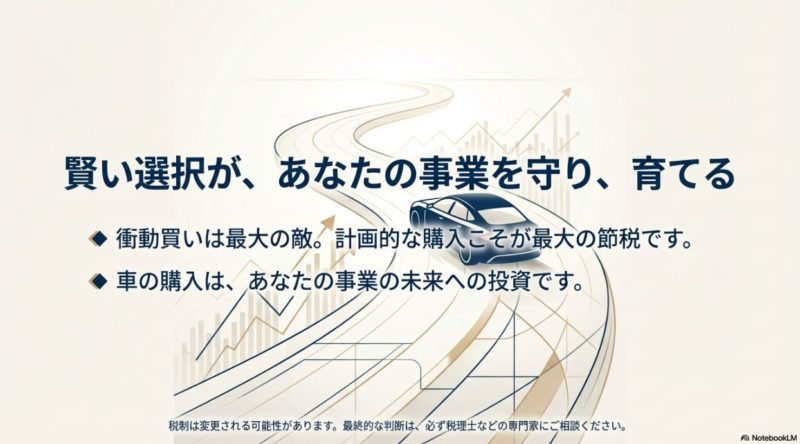 節税だけを見ると中古車が魅力的に見えますが、私はいつも「キャッシュと出口まで含めて得か?」で判断します。  節税は大事だけど、車は“事業の道具”なので、無理して買うと本末転倒です。