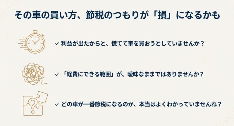 「いつ買うか」を設計できると、節税も資金繰りも落ち着きます。  逆に、設計せずに買うと、節税が“運任せ”になってしまうんですよね。