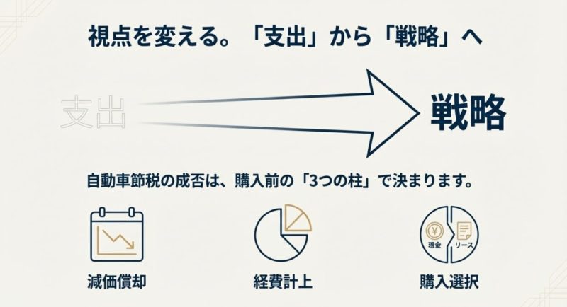 ここでは、車購入の節税がどう効くのかを、減価償却を軸に「仕組みから」整理します。  知識として知っていても、実際に申告でミスりやすいポイントがあるので、そこを先に潰していきます。