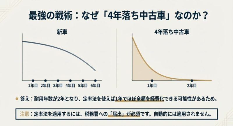 「4年落ち中古車=誰でも必ず一括で経費」は誤解になりやすいです。  償却方法(定額法か定率法か)や、事業利用の割合、使用開始月などで、結果が大きく変わります。