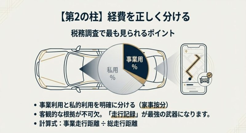 私は、按分の基準は走行距離が一番強いと思っています。  日数や感覚で決めると、税務調査で突っ込まれたときに弱いんですよね。  走行距離なら、メーター記録や日報、アプリの履歴と突合できるので、説明しやすいです。