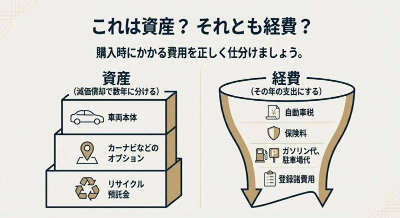 車両本体や一体のオプションは基本的に資産(車両運搬具)になりやすいです。  一方で、登録代行などの手数料、印紙などの法定費用は、その性質によって当期費用として処理されることが多いです。  リサイクル預託金は“預け金”の色が強いので、資産として残しておくのが一般的です。