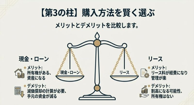 • 購入かリースか(自由度・コスト・処理の分かりやすさ)