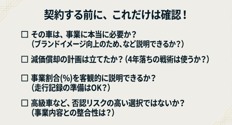 私のスタンスはシンプルで、高級車だからダメ、じゃなくて、業務性を説明できないとダメだと思っています。  逆に言えば、業務で使っている根拠が積み上がっていれば、リスクは下げられます。