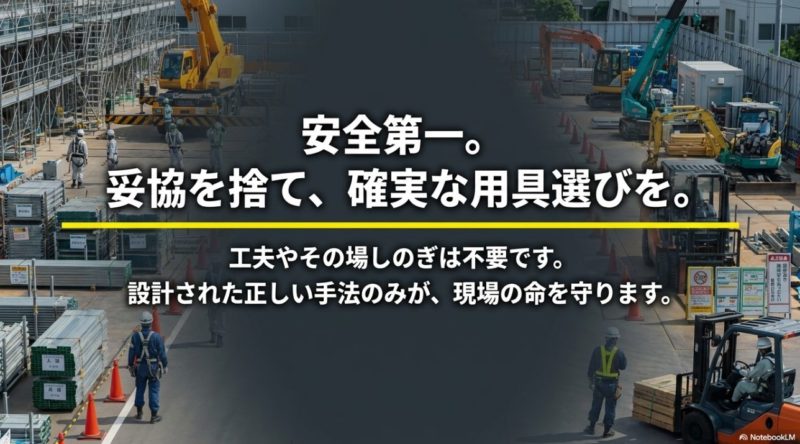 現場では急ぎの判断が求められますが、こういう場面ほど即席の工夫より、正しい道具選びが効きます。 数値や適合条件はあくまで一般的な目安です。 正確な情報は公式サイトをご確認ください。 安全や法令に関わる内容なので、最終的な判断は専門家にご相談ください。 特に重量物、偏荷重、狭所、高所、第三者が近い現場では、自己判断だけで進めないほうが安心です。