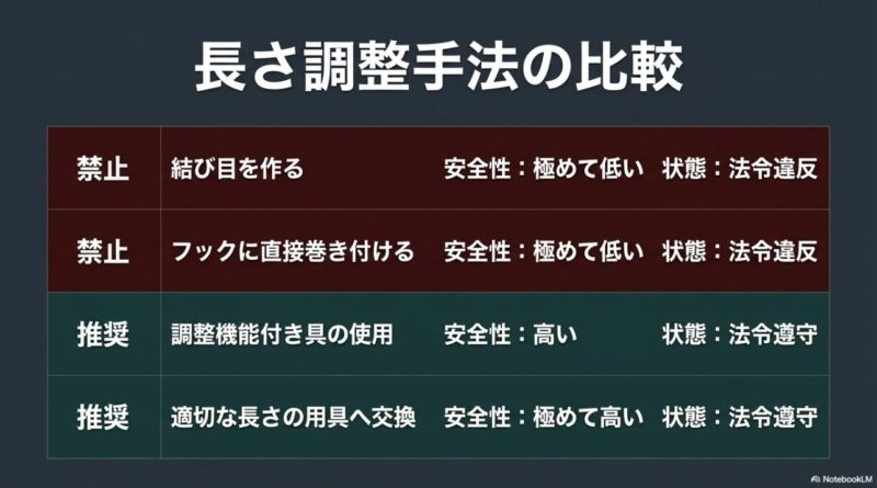 どちらを選ぶにしても、本来の用途から外れた使い方をしないことが大前提です。 短くしたいから結ぶ、という発想ではなく、その用途に合う器具を選ぶほうが結果的に安全で早いです。 正確な適用条件は公式サイトをご確認ください。