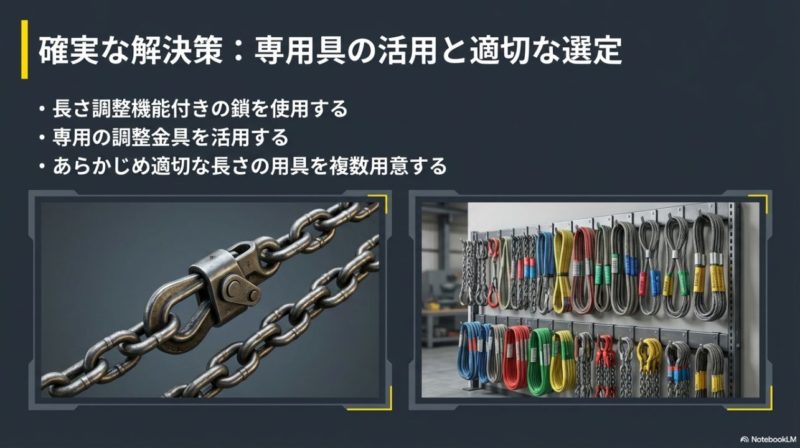 ここからは、安全側で考えるための代替策を見ていきます。 ポイントは、素材を無理に変形させるのではなく、長さ調整機能付きの仕組みを使うことです。 とくに偏荷重や頻繁な段取り替えがある現場では、チェーン系の調整機構が選択肢になりやすいです。 ただし、代替策も「チェーンなら何でもいい」わけではありません。 使用荷重、チェーン径、フックや親環の適合、吊り方、偏荷重時の片荷の見積もりまで含めて考える必要があります。 安全な代替策は、器具だけで完結するのではなく、選定と運用まで含めて初めて成立します。