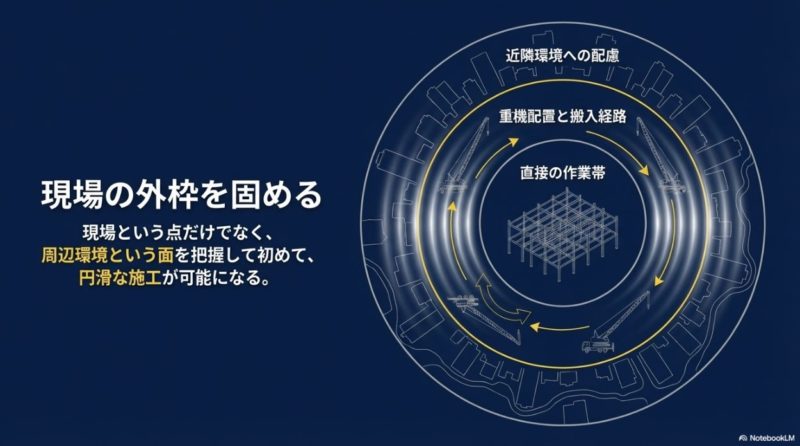 特にあなたが知りたいのは、単なる用語の説明ではなく、現場で実際にどういう順番で進み、どこで精度や安全が決まるのか、という実務の流れかなと思います。  ここ、かなり気になるところです。
