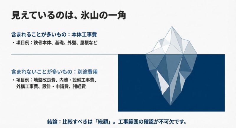 「坪単価○○万円」と書かれていても、どこまでの工事が含まれているかは会社ごとに違います。 同じ坪単価でも、内容が全然違うことがあるので、見積書では内訳を細かく確認することが大切です。 特に、鉄骨工事費とその他の工事費(内装・設備・外構など)がどう分かれているかは、あとでコスト調整するときにも効いてきます。
